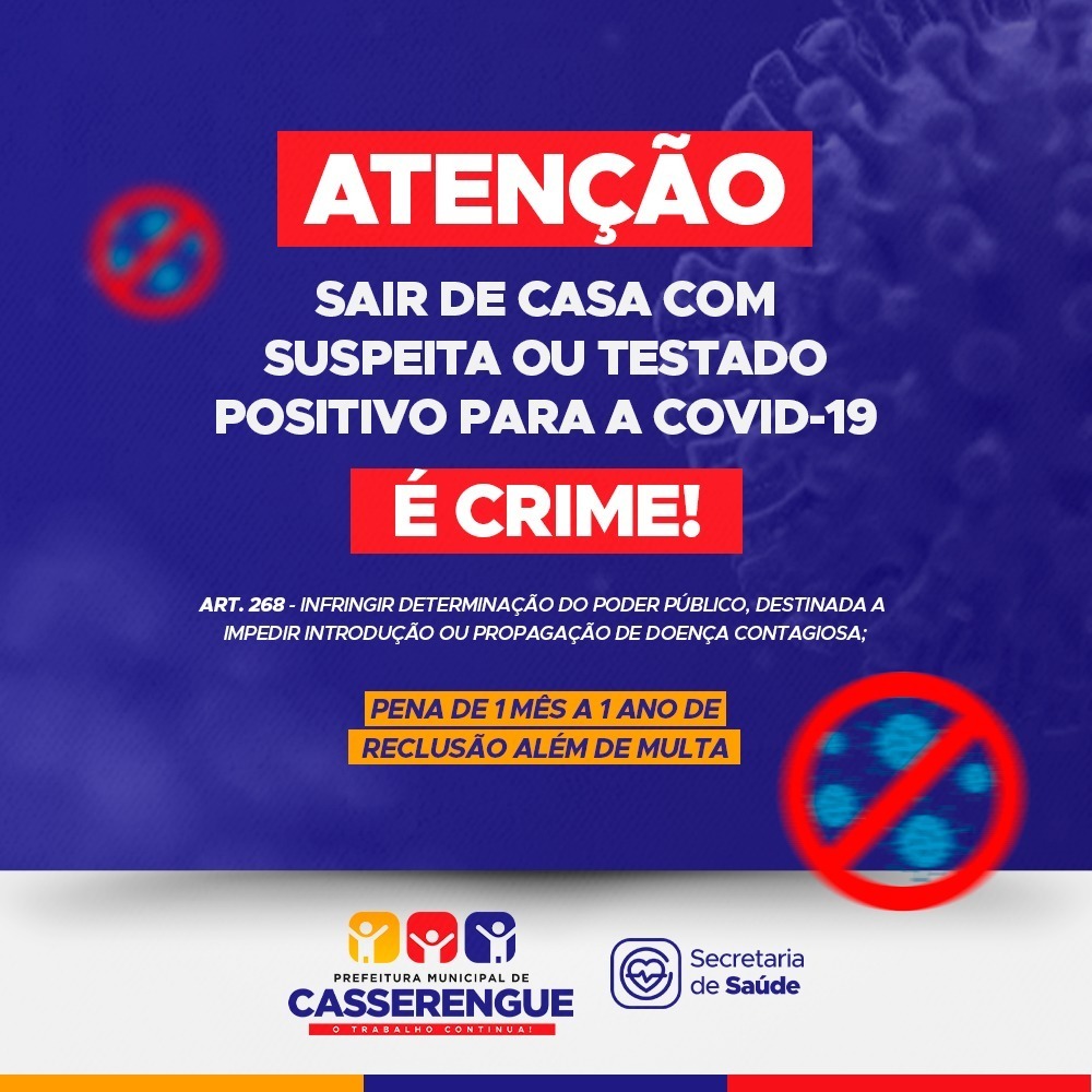 Proteja quem você ama! É CRIME sair de casa com suspeita ou testado positivo para COVID-19.