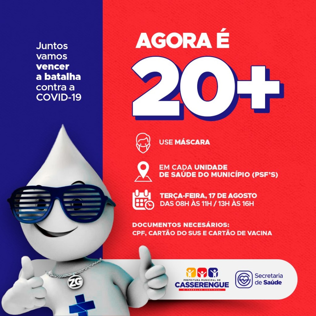 A partir de amanhã - terça-feira (17/Ago), iniciaremos a vacinação das pessoas com 20 anos - sem comorbidades. 🦯💛