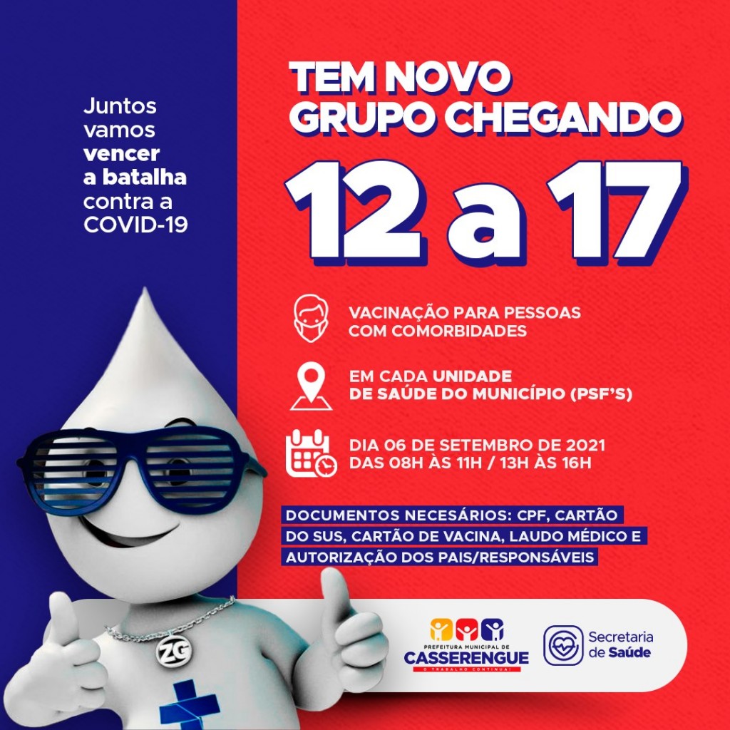 Vocês estão prontos para um novo grupo na vacinação contra a COVID-19?! Nesta segunda-feira (06/set) iniciaremos a vacinação de TODOS os jovens de 12 a 17 anos COM COMORBIDADES.