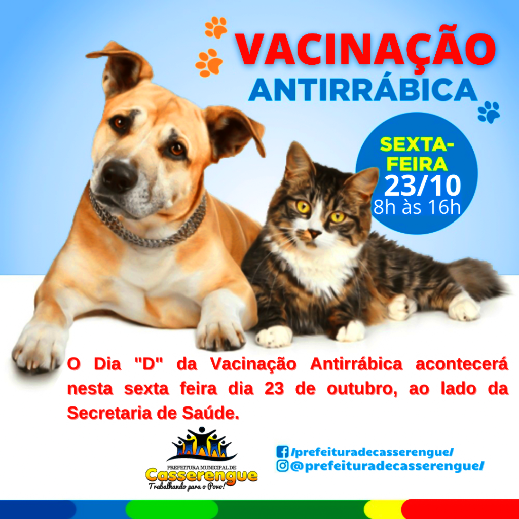 A Secretaria Municipal de saúde comunica a toda população de Casserengue que o Dia "D" da Vacinação Antirrábica acontecerá nesta sexta feira dia 23 de outubro, ao lado do Prédio da secretaria de Saúde.