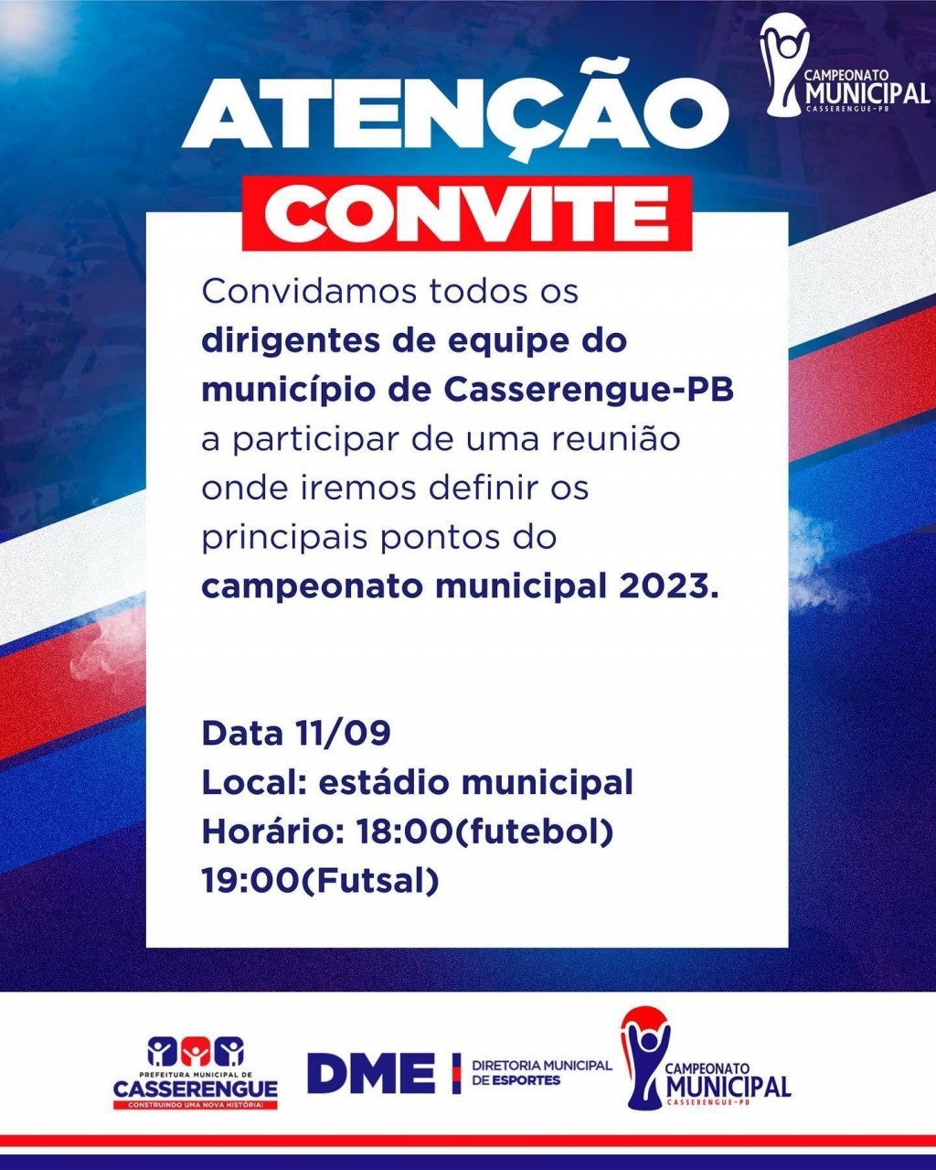 Convidamos todos os dirigentes de equipe do município de Casserengue-PB, a participar de uma reunião onde iremos definir os principais pontos do campeonato municipal 2023.