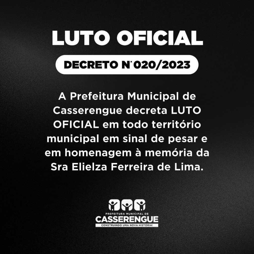 Art. 1°. Fica decretado LUTO OFICIAL no Município de Casserengue-PB, por 3 (três) dias contados desta data (21/08/2023), em decorrência do falecimento da Sra. Maria Elielza Ferreira de Lima.