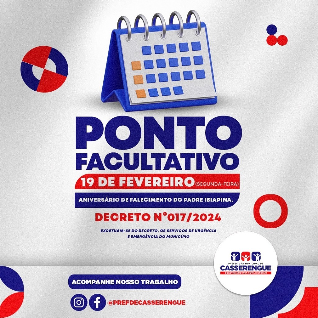 Neste dia 19 de fevereiro de 2024, segunda-feira, considerando o Decreto 17/2024, é ponto facultativo no município em virtude d0 aniversário do falecimento do Padre Ibianpina.