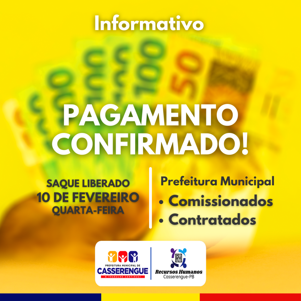 Cumprindo o calendário de pagamentos do funcionalismo, a Prefeitura Municipal de Casserengue informa o pagamento dos servidores municipais, contratos e comissionados hoje, 10 de fevereiro de 2021. Os proventos são referentes ao mês de janeiro 2021.