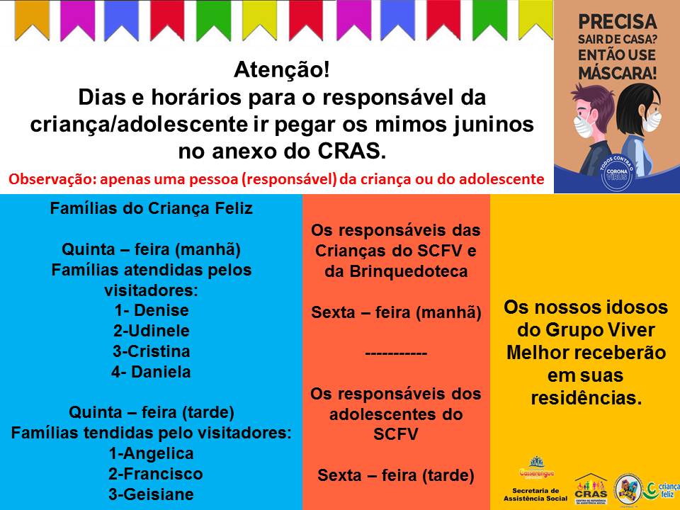 A Secretaria de Assistência Social promoverá entrega de kits higiênicos e mimos juninos para as crianças, adolescentes e idosos inscritos em seus programas (CF, SCFV e Brinquedoteca)