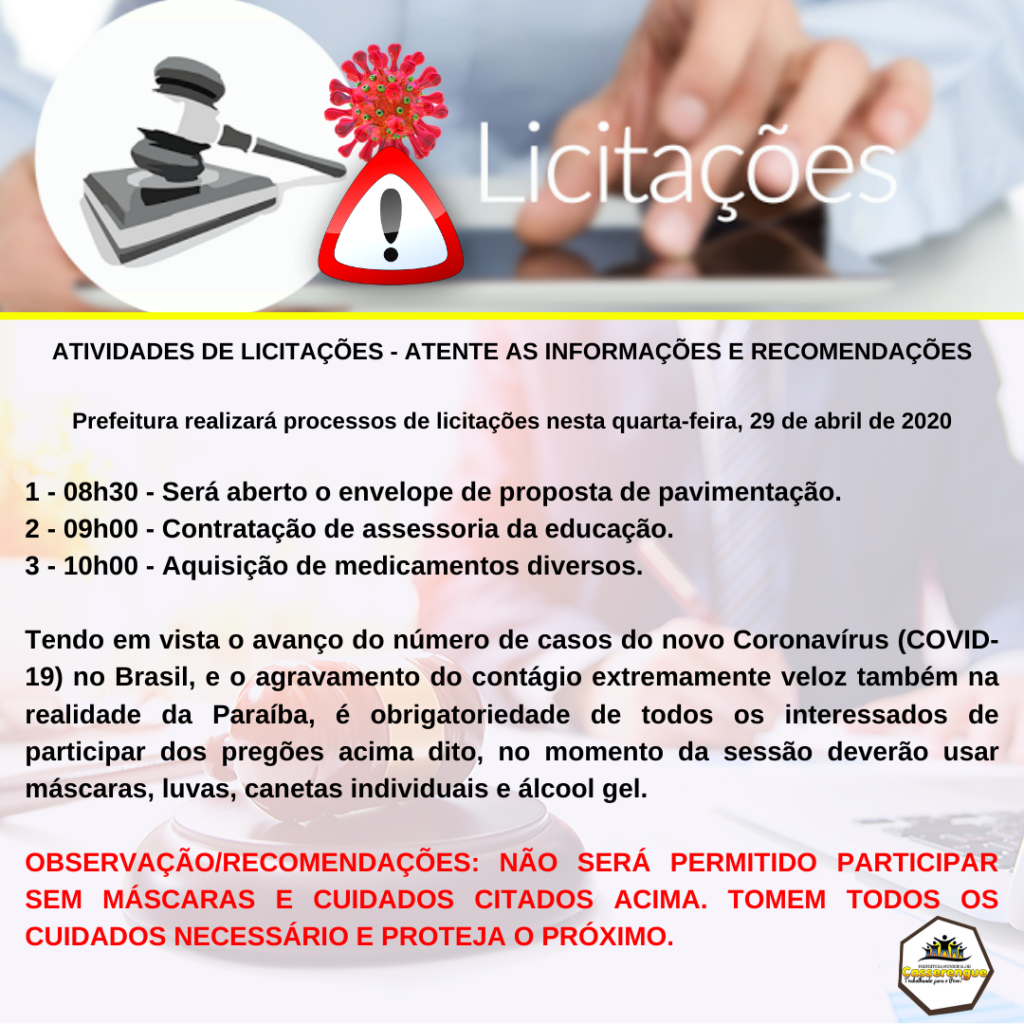 Tendo em vista o avanço do número de casos do novo Coronavírus (COVID-19) no Brasil, e o agravamento do contágio extremamente veloz também na realidade da Paraíba, é obrigatoriedade de todos os interessados de participar dos pregões acima dito, no momento da sessão deverão usar máscaras, luvas, canetas individuais e álcool gel.