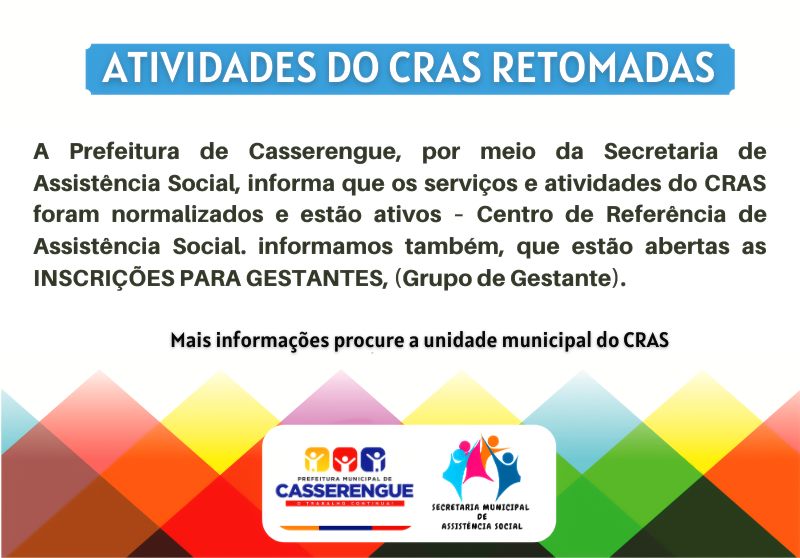 A Prefeitura de Casserengue, por meio da Secretaria de Assistência Social, informa que os serviços e atividades do CRAS foram normalizados e estão ativos – Centro de Referência de Assistência Social. informamos também, que estão abertas as INSCRIÇÕES PARA GESTANTES, (Grupo de Gestante).