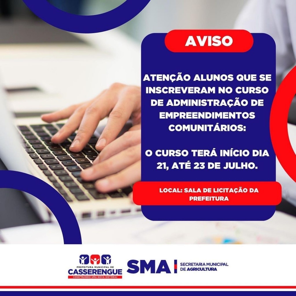 Atenção alunos que se inscreveram no curso de administração de empreendimentos comunitários: o curso terá início dia 21, até 23 de julho.