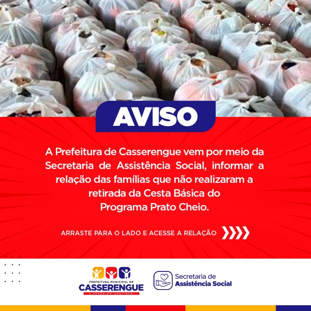 A Prefeitura Municipal de Casserengue vem por meio da Secretaria de Assistência Social, informar a relação das pessoas/famílias que não retiraram a Cesta Básica alusiva ao Programa Prato Cheio.