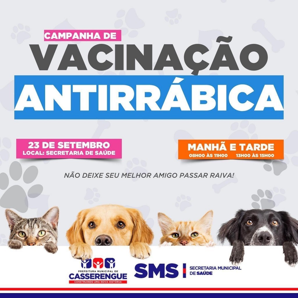 Neste sábado(23/set) realizaremos a Campanha de Vacinação Antirrábica. A vacinação ocorrerá ao lado da Secretaria de Saúde.