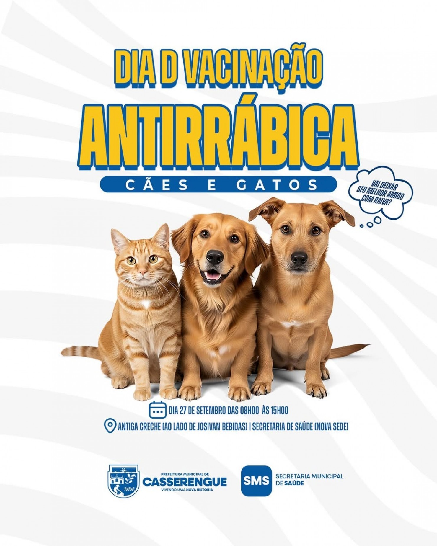 Atenção, Casserengue! Neste sábado (27/09) será realizada a Campanha de Vacinação Antirrábica.