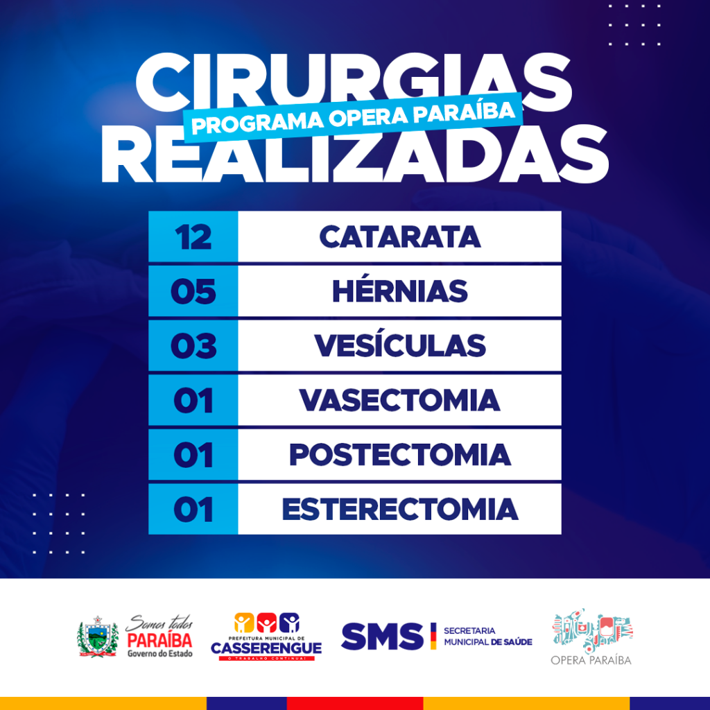 A Prefeitura de Casserengue por meio da Secretaria de Saúde e do Programa Opera Paraíba, já realizou 23 cirurgias entre hérnias, vesículas, cataratas e outras comorbidades. São pacientes residentes em nosso município que recebem o encaminhamento através da Secretaria e realizam os procedimentos.