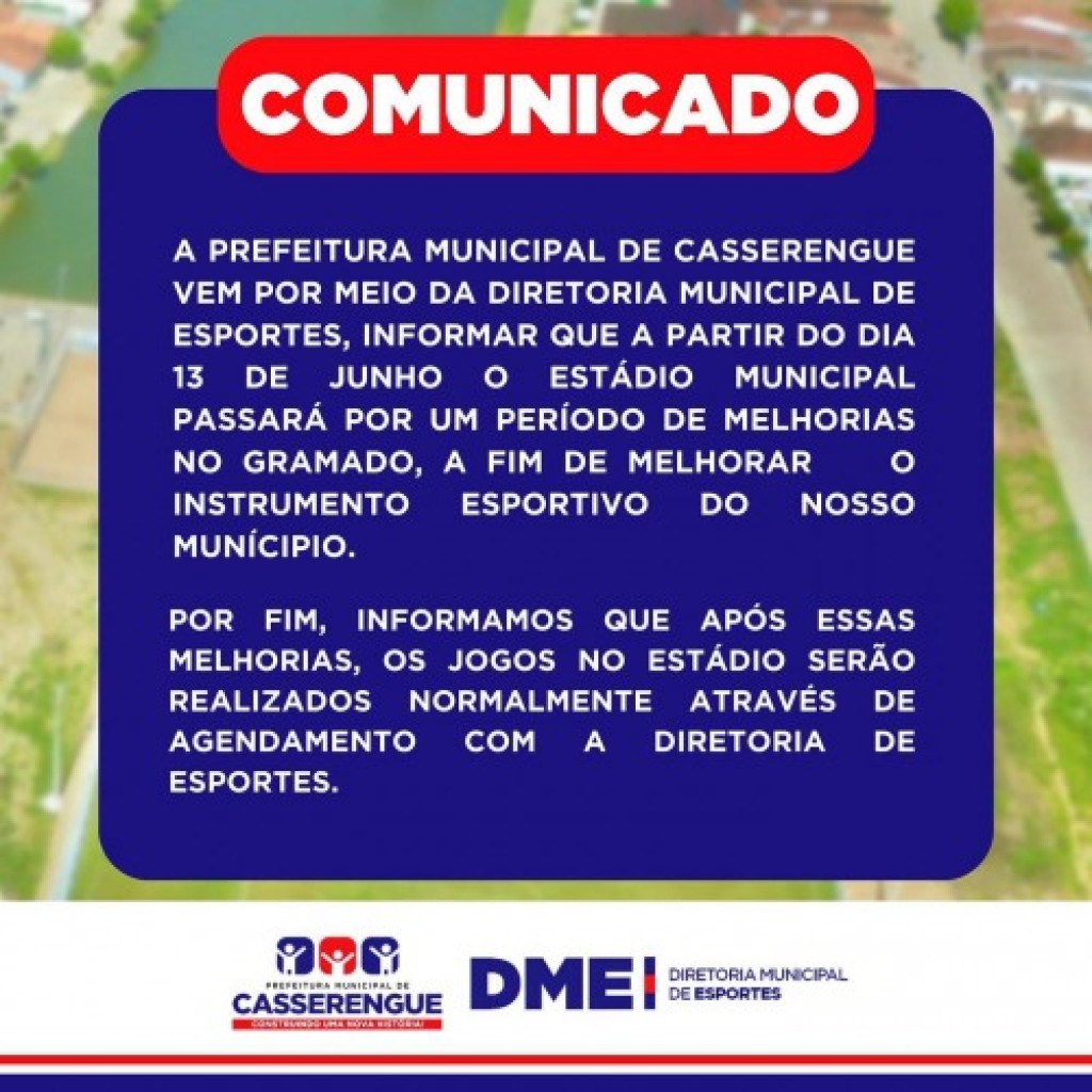 A PREFEITURA MUNICIPAL DE CASSERENGUE VEM POR MEIO DA DIRETORIA DE ESPORTES, INFORMAR QUE A PARTIR DO DIA 13 DE JUNHO O ESTÁDIO MUNICIPAL PASSARÁ POR UM PERÍODO DE MELHORIAS NO GRAMADO, A FIM DE MELHORAR O INSTRUMENTO ESPORTIVO DO NOSSO MUNICÍPIO.