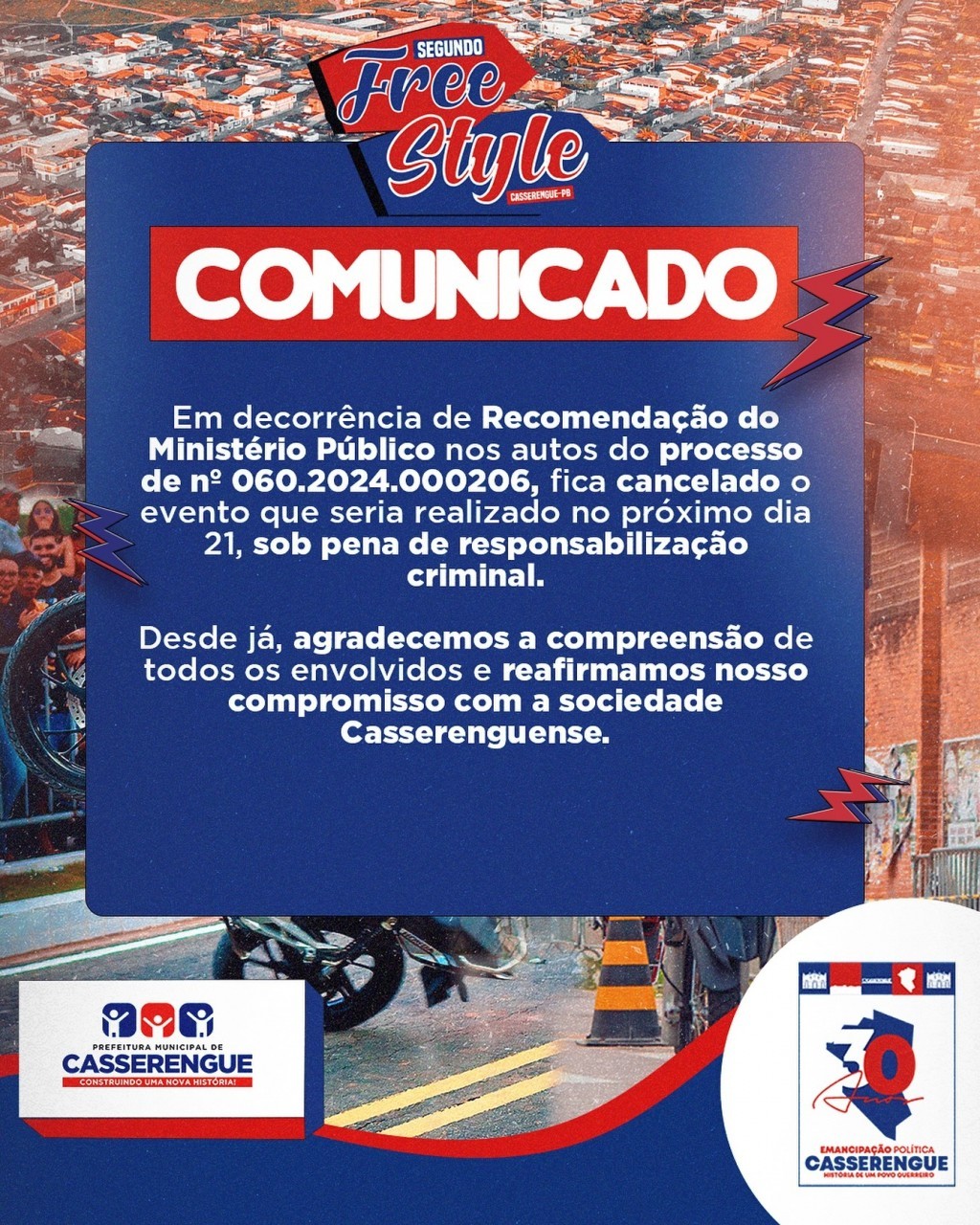 Em decorrência de Recomendação do Ministério Público nos autos do processo de n° 060.2024.000206, fica cancelado o evento que seria realizado no próximo dia 21, sob pena de responsabilização criminal.