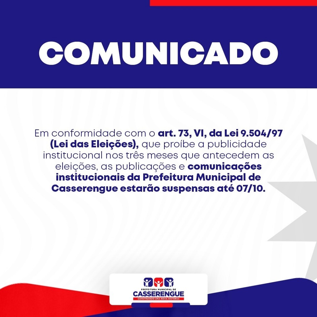 A Prefeitura Municipal de Casserengue informa que, em conformidade com o Art. 73, Inciso VI, da Lei nº 9.504/97 (Lei das Eleições), que estabelece a proibição de publicidade institucional nos três meses que antecedem as eleições, as publicações e comunicações institucionais estarão suspensas até o dia 7 de outubro.