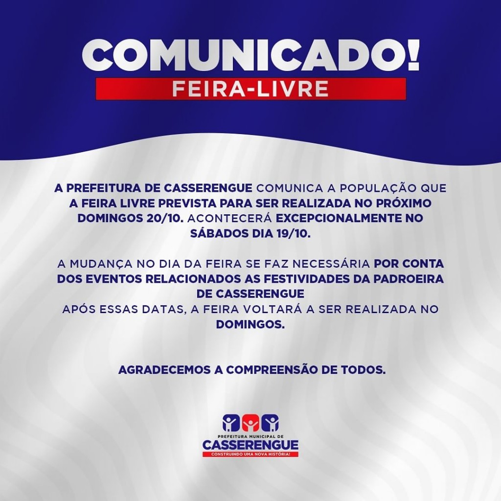 A Prefeitura de Casserengue informa à população que a feira livre prevista para ser realizada no próximo domingo, 20 de outubro, acontecerá excepcionalmente no sábado, dia 19 de outubro.