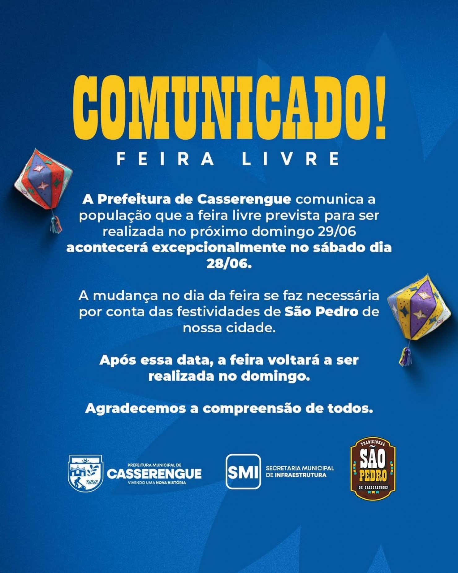 A Prefeitura de Casserengue comunica a população que a feira livre prevista para ser realizada no próximo domingo 29/06 acontecerá excepcionalmente no sábado dia 28/06.