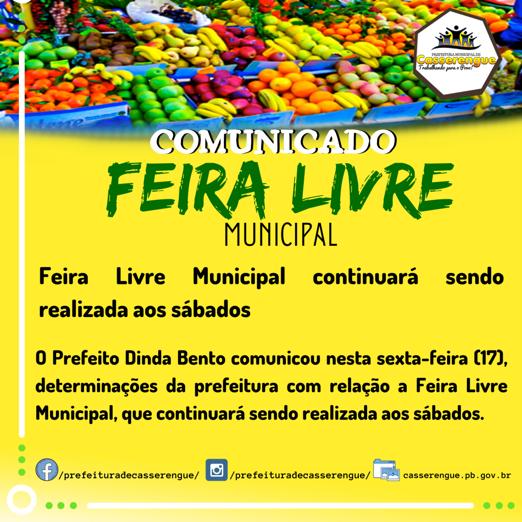 O Prefeito Dinda Bento comunicou nesta sexta-feira (17), determinações da prefeitura com relação a Feira Livre Municipal, que continuará sendo realizada aos sábados.