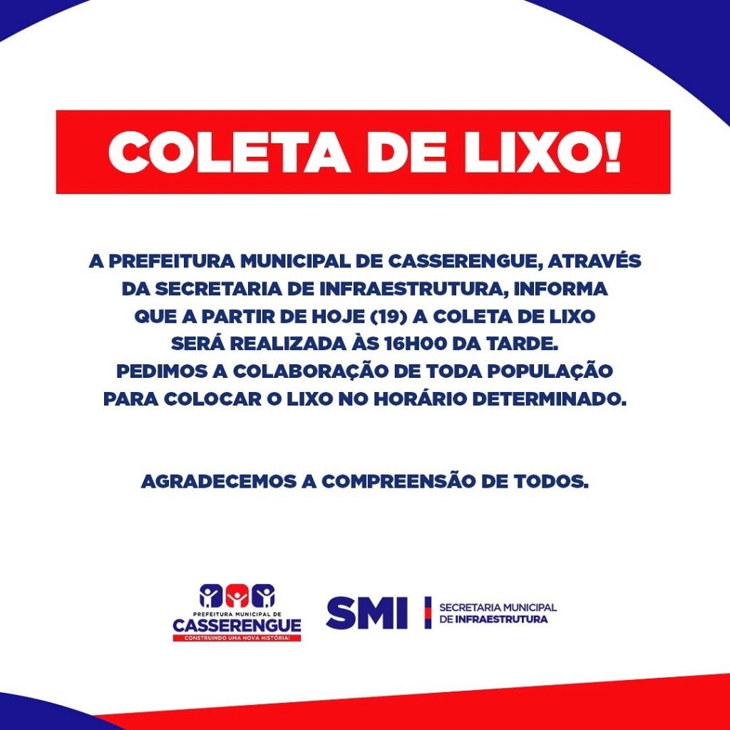 A Prefeitura Municipal de Casserengue, por meio da Secretaria de Infraestrutura, informa à população que, a partir de hoje (19), a coleta de lixo será realizada diariamente às 16h00.