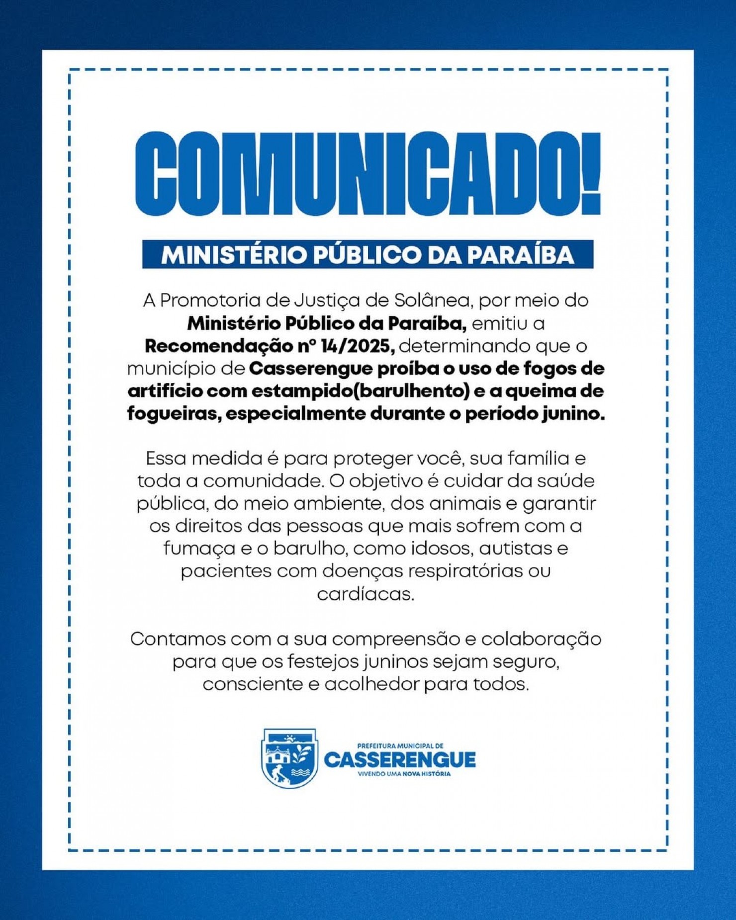 A Promotoria de Justiça de Solânea, por meio do Ministério Público da Paraíba, emitiu a Recomendação nº 14/2025, orientando que o município de Casserengue proíba o uso de fogos de artifício com estampido (barulho) e a queima de fogueiras, especialmente durante o período junino.