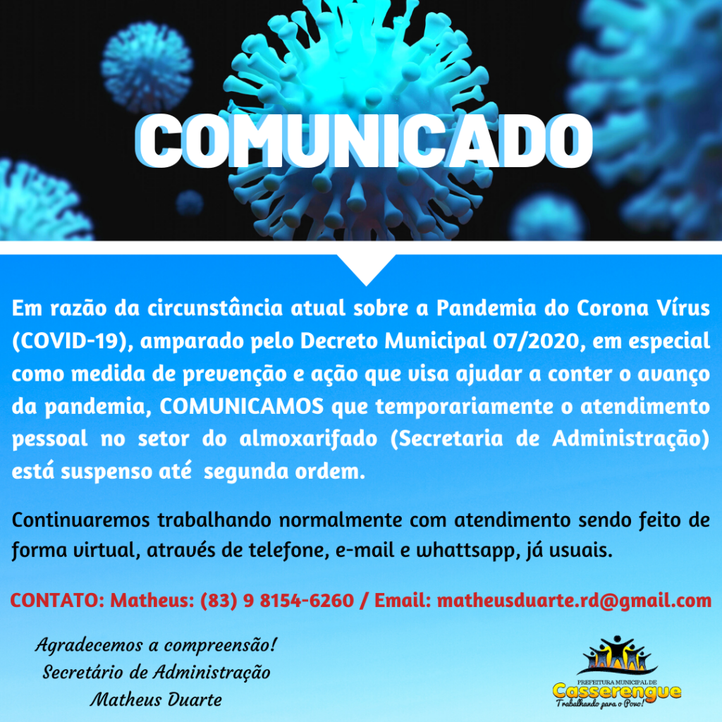Em razão da circunstância atual sobre a Pandemia do Corona Vírus (COVID-19), amparado pelo Decreto Municipal 07/2020, em especial como medida de prevenção e ação que visa ajudar a conter o avanço da pandemia, COMUNICAMOS que temporariamente o atendimento pessoal no setor do almoxarifado (Secretaria de Administração) está suspenso até segunda ordem.