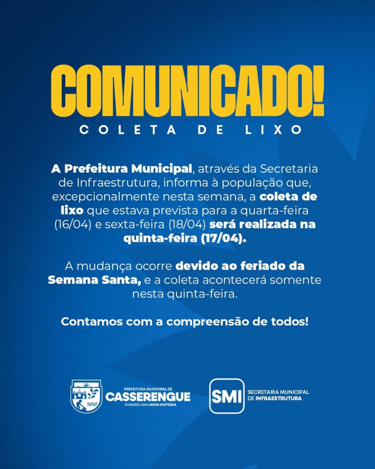 A Prefeitura Municipal, através da Secretaria de Infraestrutura, informa à população que, excepcionalmente nesta semana, a coleta de lixo que estava prevista para a quarta-feira (16/04) e sexta-feira (18/04) será realizada na quinta-feira (17/04).