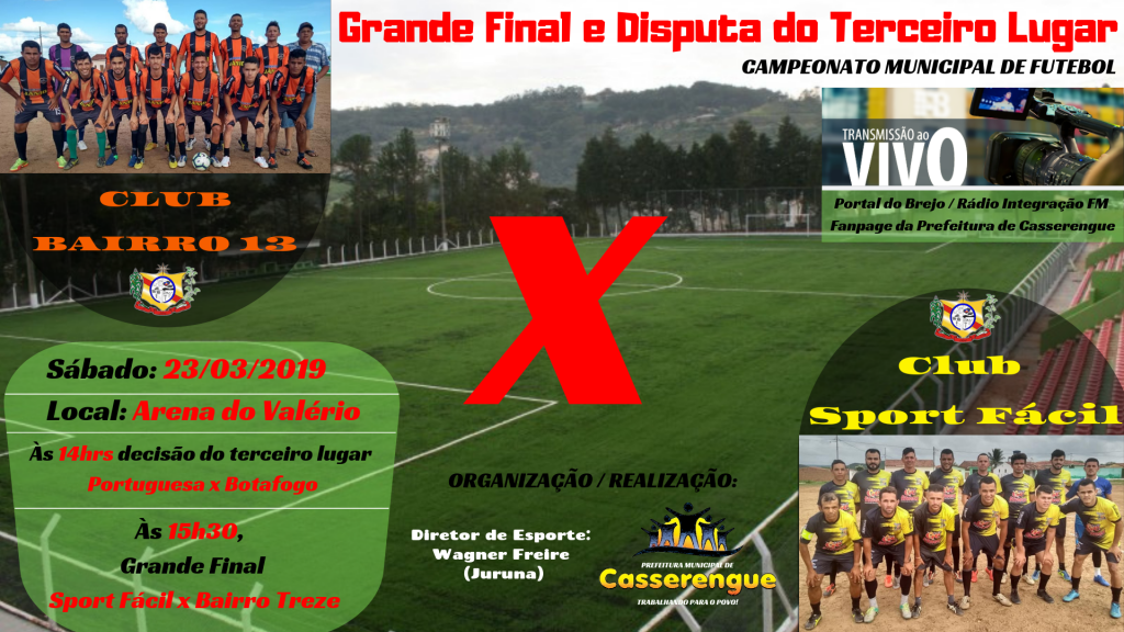 A Prefeitura de Casserengue, através do Diretor Municipal de Esporte, vem por meio deste convidar a toda população para prestigiar a Grande Final do Campeonato Municipal de Futebol, que acontecerá no dia 23 de março (sábado) a partir das 14hrs, na Arena do Valério.