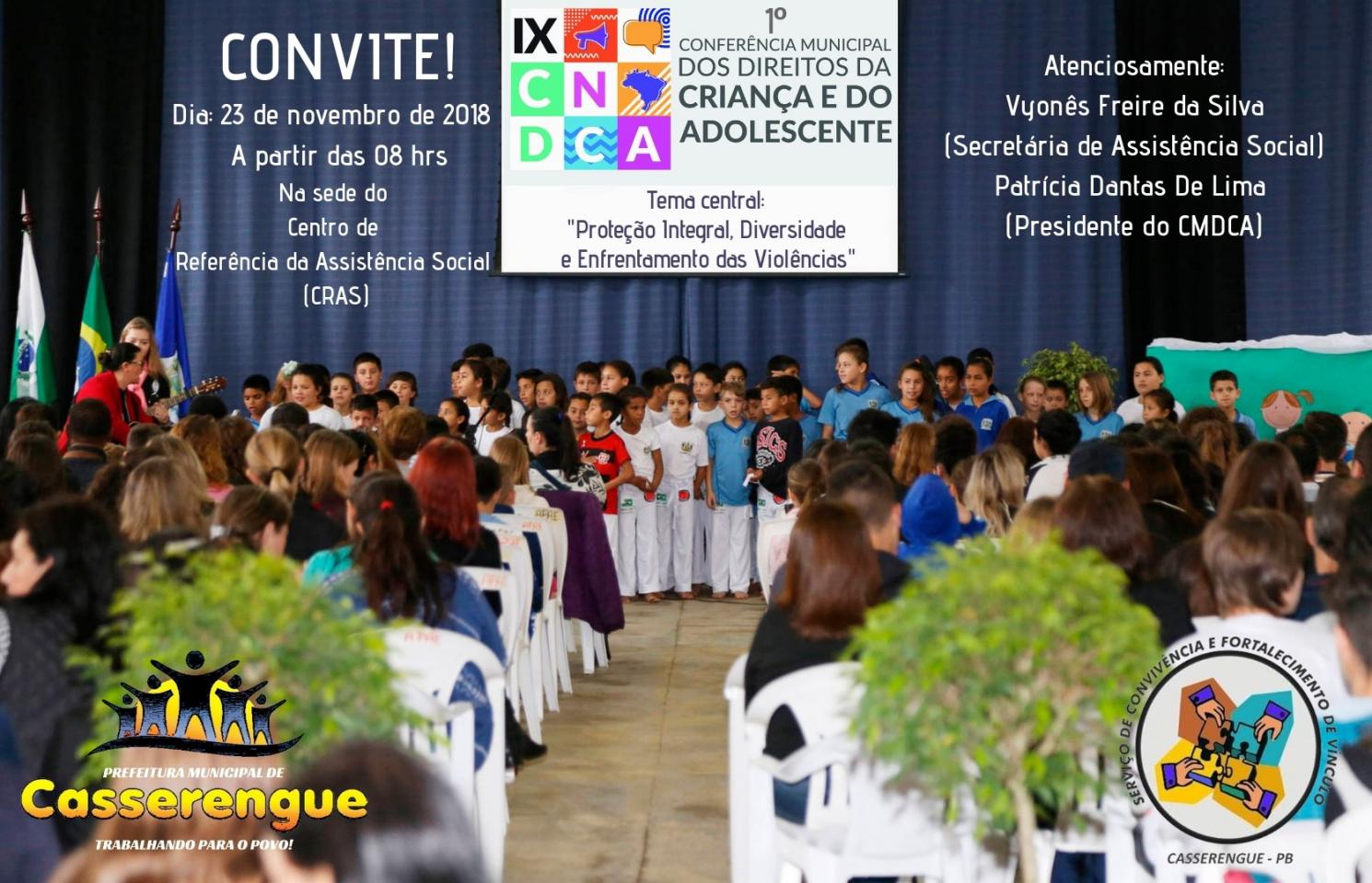 O Conselho Municipal do Direito da Criança do Adolescente – CMDCA, juntamente com a Secretaria Municipal de Assistência Social – SMAS tem a honra de convidar V. Sa., para participar da I Conferência Municipal dos Direitos da Criança e do Adolescente, que será realizado no dia 23 de novembro do corrente ano, no período das 08h as 17h Na sede do Centro de Referência da Assistência Social (CRAS) – Centro. A Conferência tem por Tema: "Proteção Integral, Diversidade e Enfrentamento das Violências ". Na certeza de estarmos contribuindo para fazer valer os direitos de nossas crianças e adolescentes. Contamos com a sua presença!