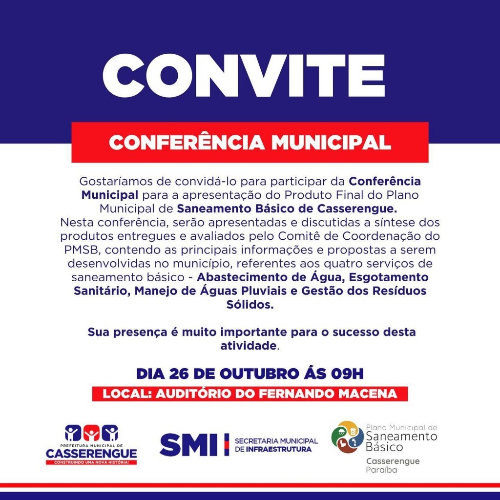 Gostaríamos de convidá-lo para participar da Conferência Municipal para a apresentação do Produto Final do Plano Municipal de Saneamento Básico de Casserengue.