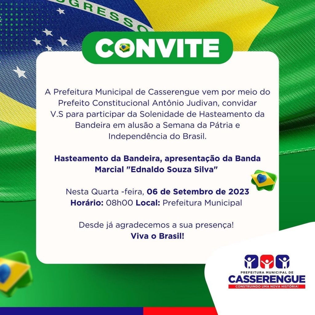 A Prefeitura Municipal de Casserengue vem por meio do Prefeito Constitucional Antônio Judivan, convidar V.S para participar da Solenidade de Hasteamento da Bandeira em alusão a Semana da Pátria e Independência do Brasil.