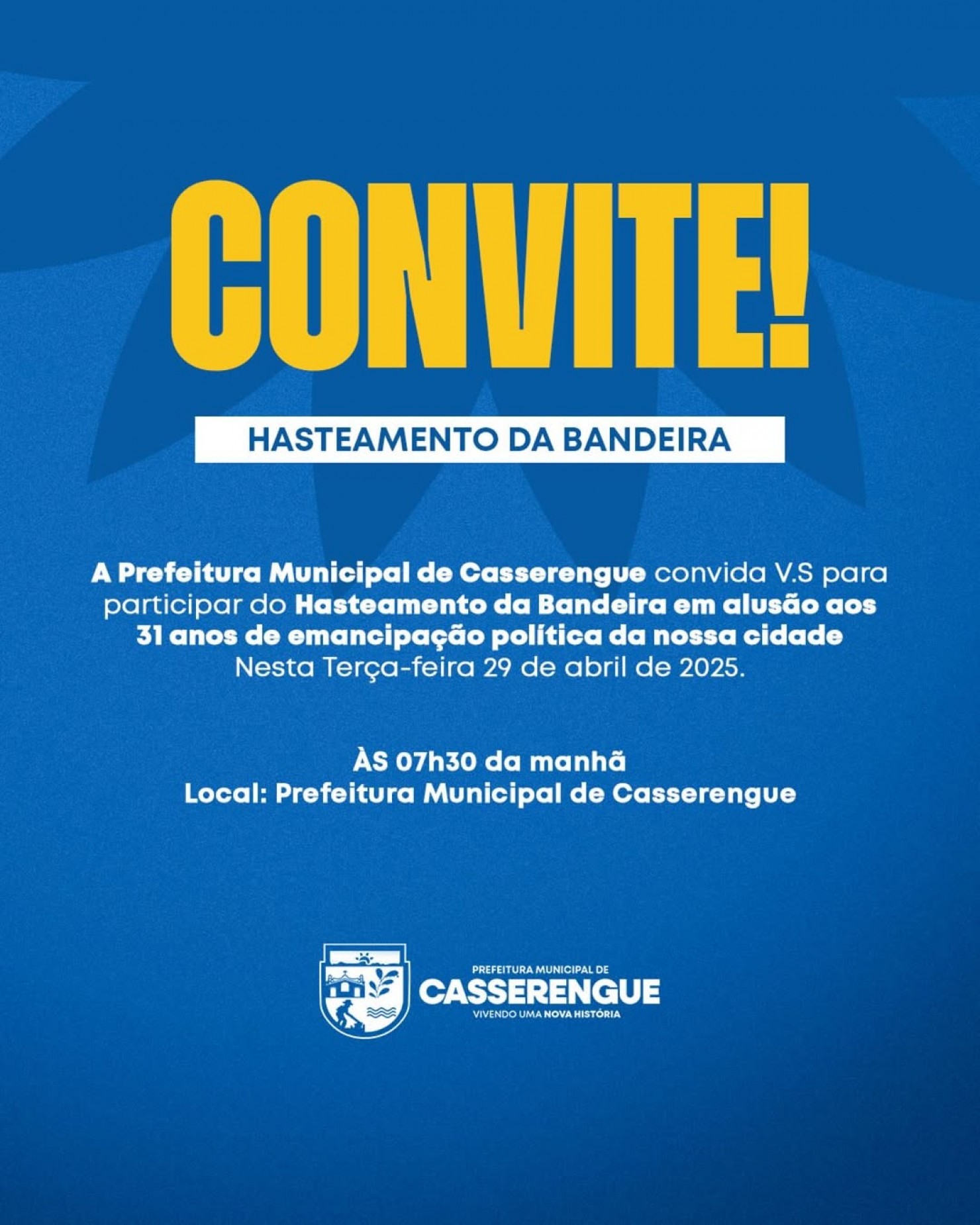 A Prefeitura Municipal de Casserengue convida V.S para participar do Hasteamento das Bandeira em alusão aos 31 anos de emancipação política da nossa cidade.