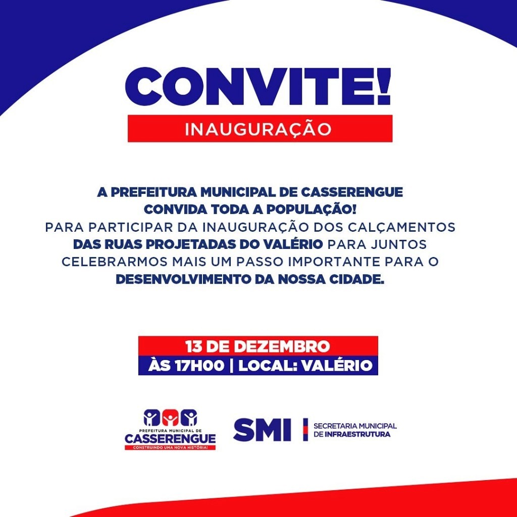 Para participar da inauguração dos Calçamentos Das Ruas Projetadas do Valério para juntos celebramos mais um passo importante para o desenvolvimento da nossa cidade.