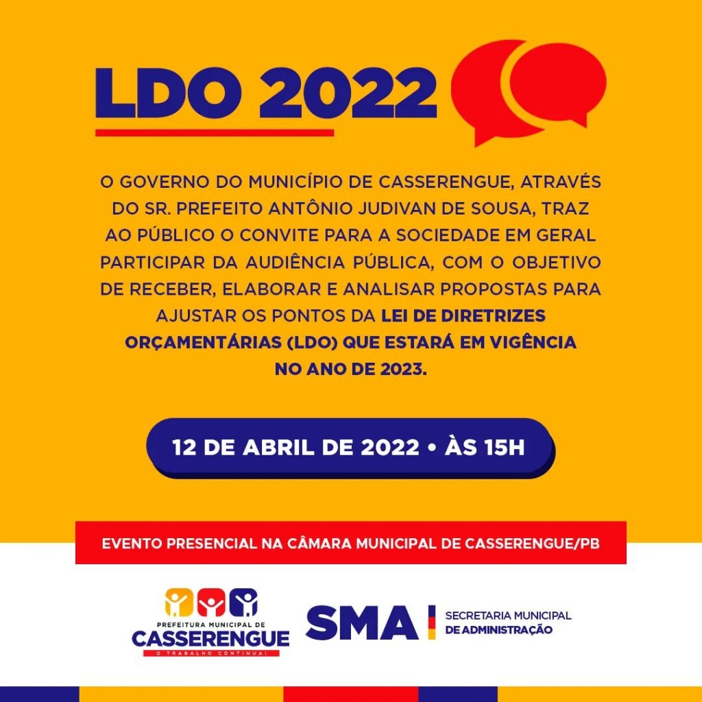 O Governo do Município de Casserengue, através do Sr. Prefeito Antônio Judivan de Sousa (Van), traz ao público o convite para a sociedade em geral participar da audiência pública, com o objetivo de receber, elaborar e analisar propostas para ajustar os pontos da Lei de Diretrizes Orçamentárias (LDO) que estará em vigência no ano de 2023.