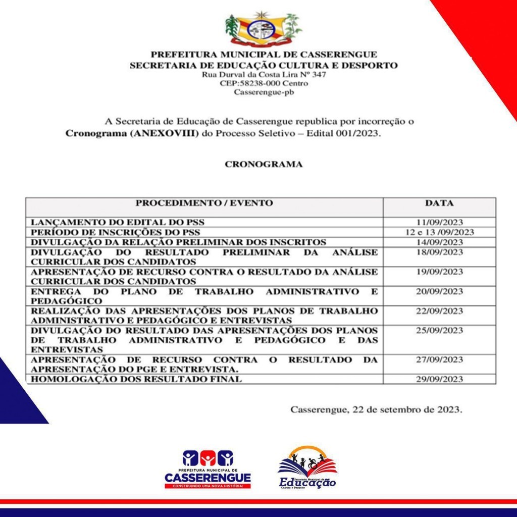 Cronograma (ANEXO VIII) do Processo Seletivo – Edital 001/2023 - A Secretaria de Educação de Casserengue republica por incorreção o