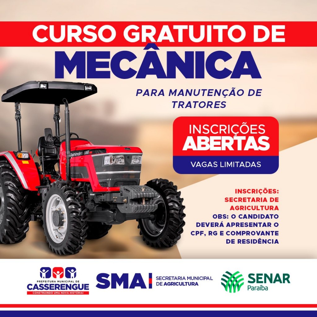 A Prefeitura Municipal de Casserengue, através da Secretaria de Agricultura, em parceria com o SENAR -Serviço Nacional de Aprendizagem Rural - abre inscrições para o Curso: Mecânica para manutenção de tratores, que será realizado de forma gratuita.