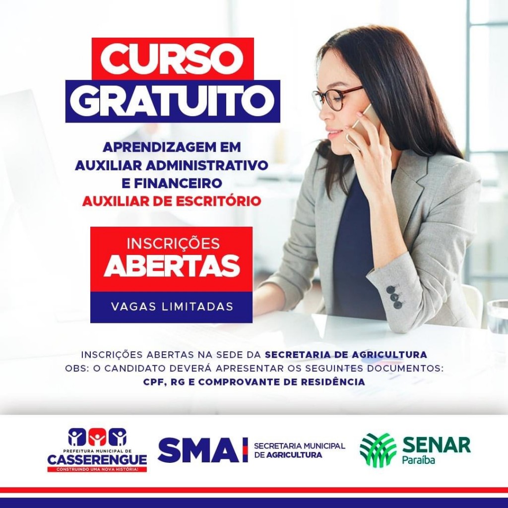 A Prefeitura Municipal de Casserengue, por meio da Secretaria de Agricultura e em parceria com o Serviço Nacional de Aprendizagem Rural da Paraíba (SENAR/PB), informa que estão abertas as inscrições GRATUITAS para o curso de Aprendizagem em Auxiliar Administrativo e Financeiro (Auxiliar de Escritório).