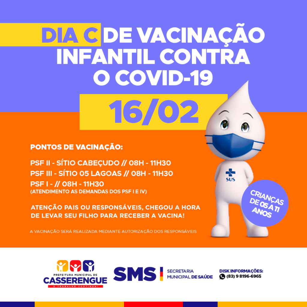 Amanhã (16/fev) é nosso DIA C de vacinação infantil contra o COVID-19 em Casserengue