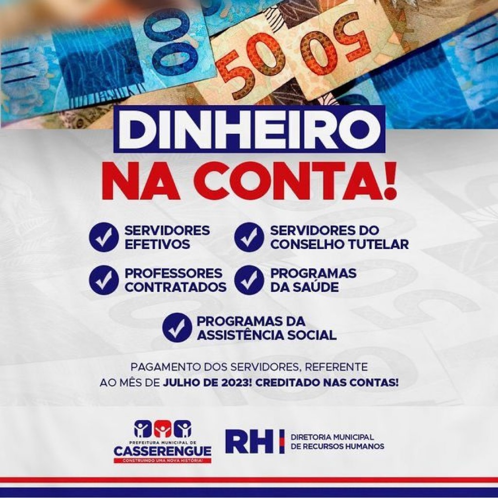 A Prefeitura de Casserengue por meio da Diretoria de Recursos Humanos informa que o pagamento alusivo ao mês de Julho de 2023 já está disponível em conta para retirada.