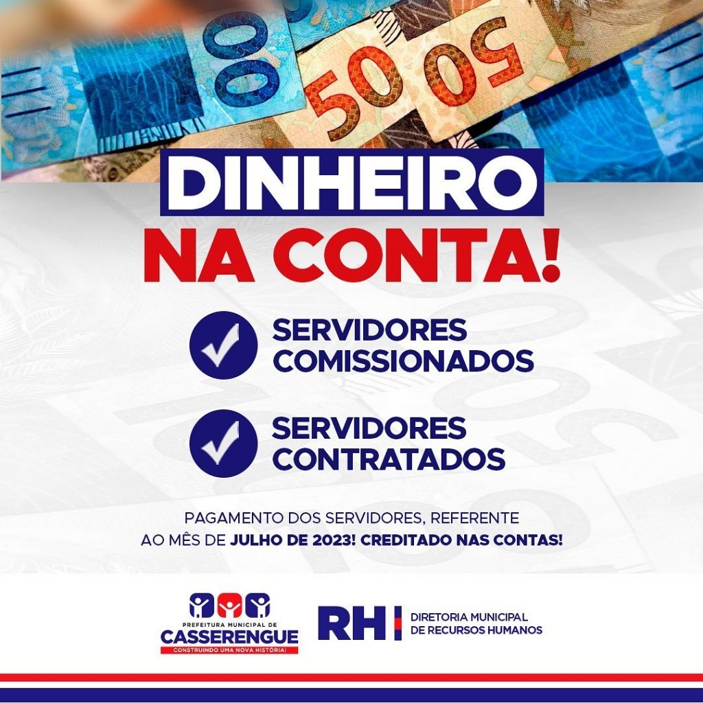 A Prefeitura de Casserengue por meio da Diretoria de Recursos Humanos informa que o pagamento alusivo ao mês de Julho de 2023 já está disponível em conta para retirada.