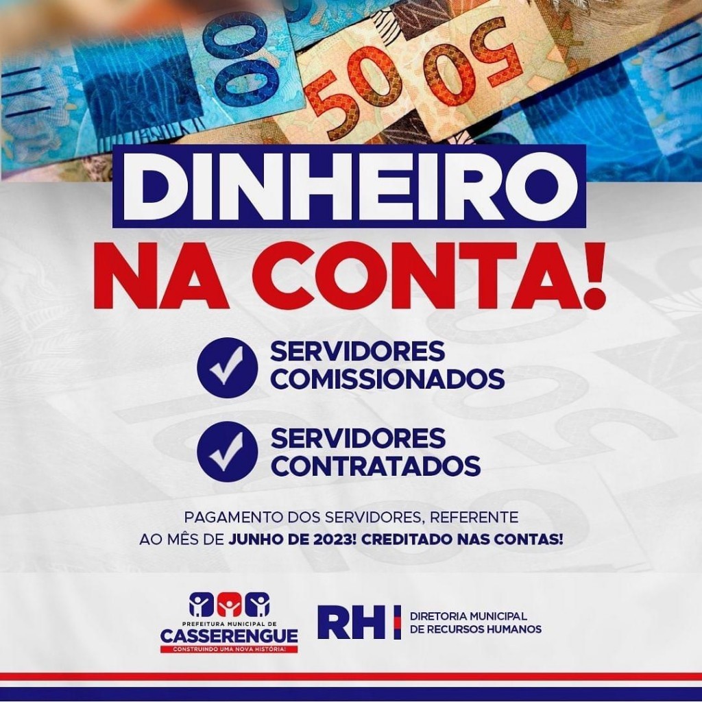 A Prefeitura de Casserengue por meio da Diretoria de Recursos Humanos informa que o pagamento alusivo ao mês de Junho de 2023 já está disponível em conta para retirada.