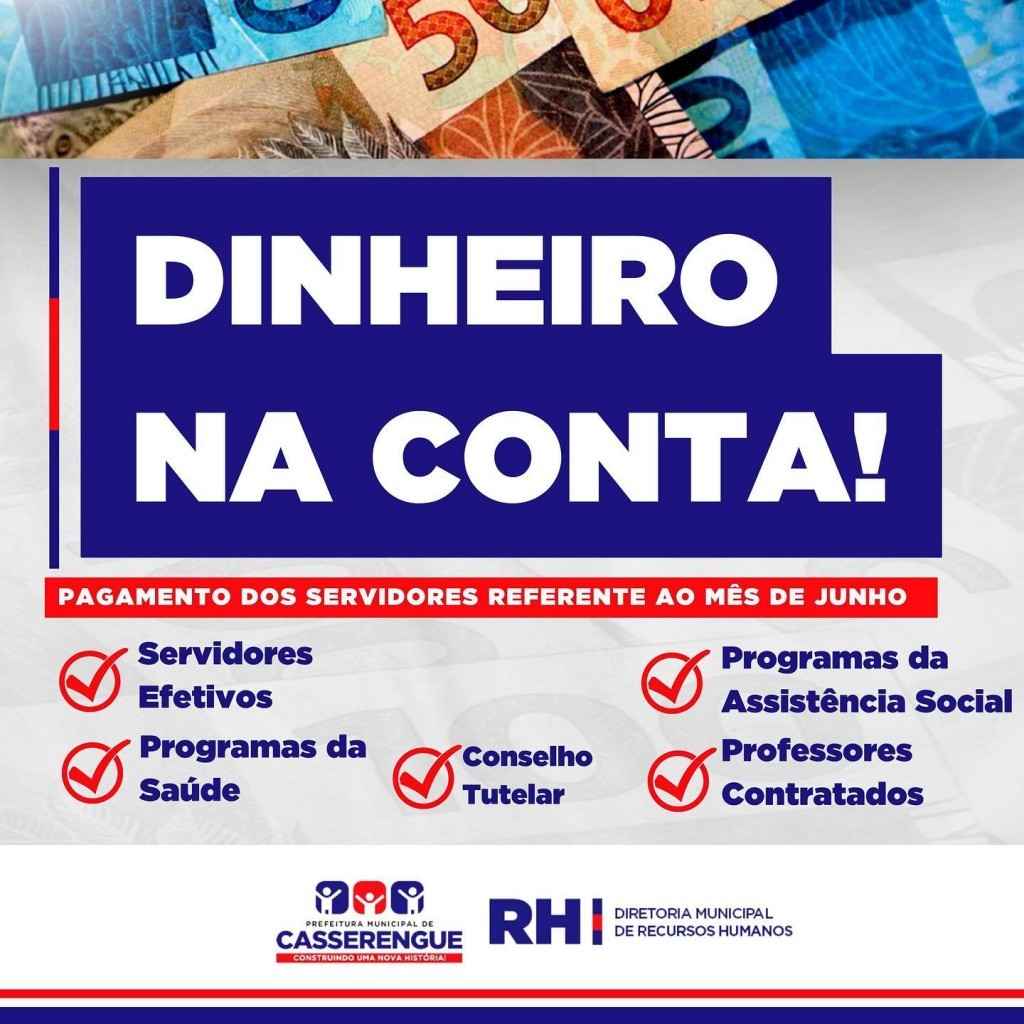 A Prefeitura de Casserengue por meio da Diretoria de Recursos Humanos informa que o pagamento alusivo ao mês de maio de 2023 já está disponível em conta para retirada.