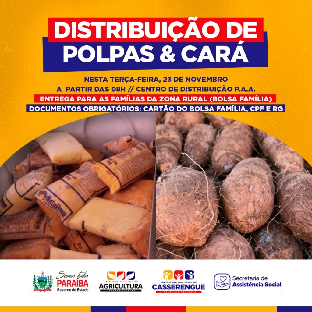 A Secretaria Municipal de Assistência Social realizará nesta terça-feira (23/nov), em parceria com o Governo Estadual e a Secretaria Executiva de Segurança Alimentar e Economia - Solidária vinculada a - SEDH - a entrega de Polpas De Frutas & Carás do Programa de Aquisição de Alimentos (PAA) para as famílias da Zona Rural - Bolsa Família.