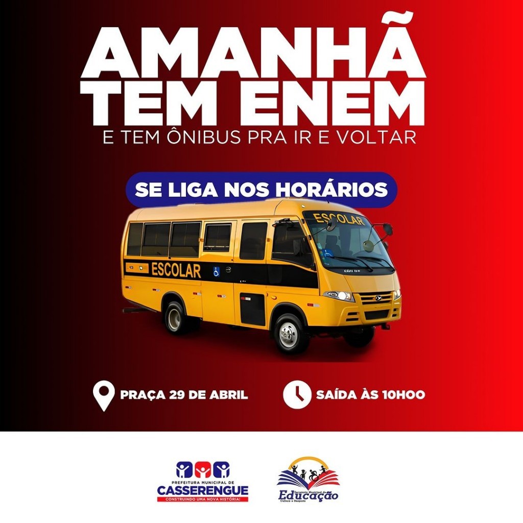 A Prefeitura de Casserengue está oferecendo transporte gratuito para todos os estudantes do município que irão prestar o Exame Nacional do Ensino Médio (Enem) nos dias 3 e 10 de novembro.