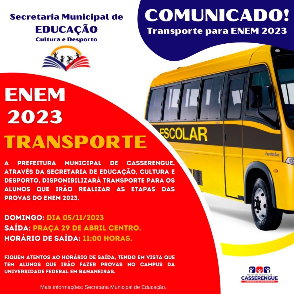 A Prefeitura Municipal de Casserengue, através da Secretaria de Educação, Cultura e Desporto, disponibilizará transporte para os alunos que irão realizar as etapas das provas do ENEM 2023.