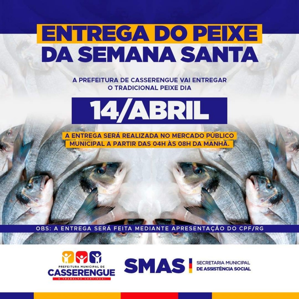 A partir das 4h da manhã desta quinta-feira (14/abr), a Prefeitura Municipal de Casserengue, através da Secretaria de Assistência Social (SMAS), realizará a entrega do tradicional peixe da Semana Santa às famílias casserenguenses.