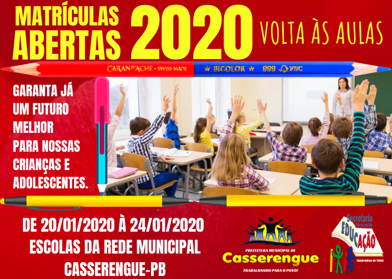 MATRÍCULAS ABERTAS DE 20/01/2020 À 24/01/2020 - ESCOLAS DA REDE MUNICIPAL CASSERENGUE-PB.