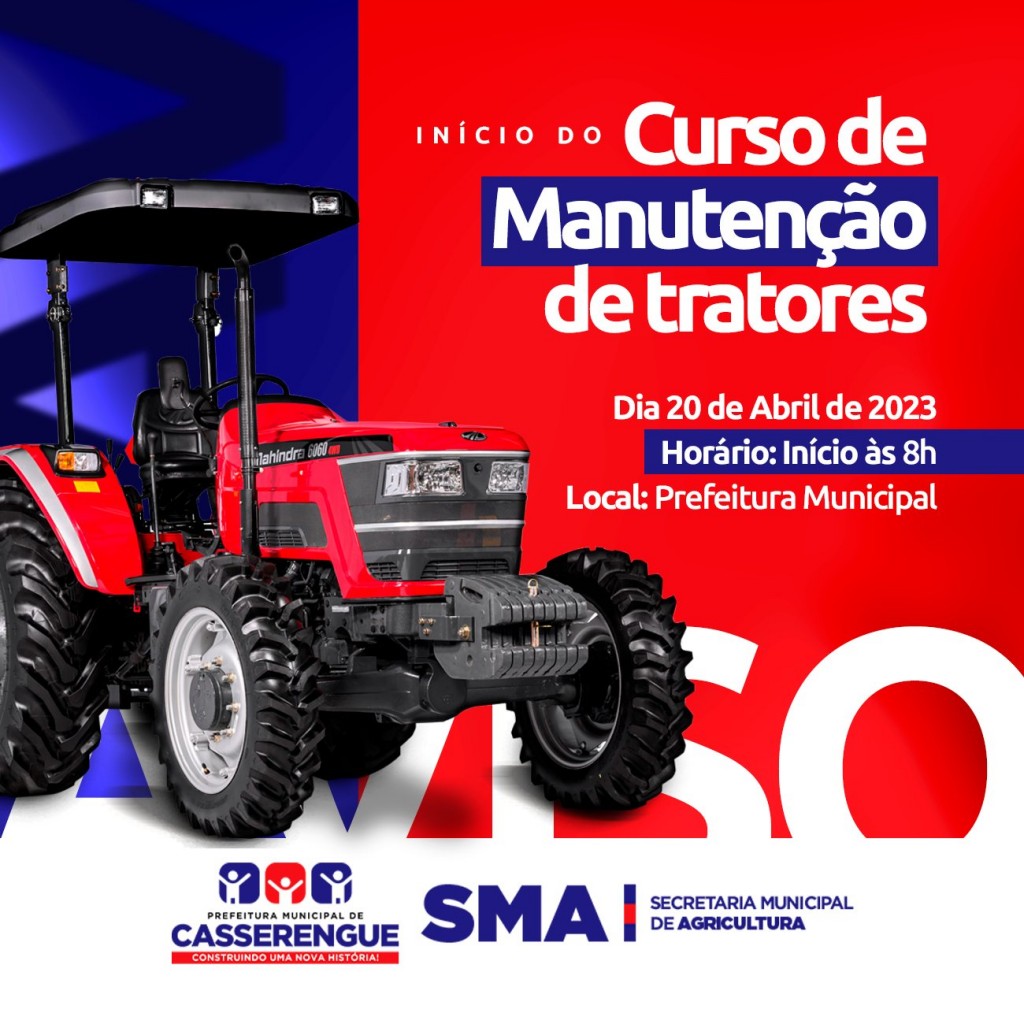 A Prefeitura Municipal de Casserengue, através da Secretaria de Agricultura, em parceria com o SENAR - Serviço Nacional de Aprendizagem Rural - realizará o Curso de Mecânica para Manutenção de Tratores, de forma gratuita, dia 20/Abril às 8h na sede da Prefeitura Municipal.