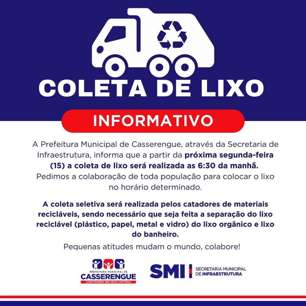 A Prefeitura Municipal de Casserengue, através da Secretaria de Infraestrutura, informa que a partir da próxima segunda-feira (15) a coleta de lixo será realizada as 6:30 da manhã.