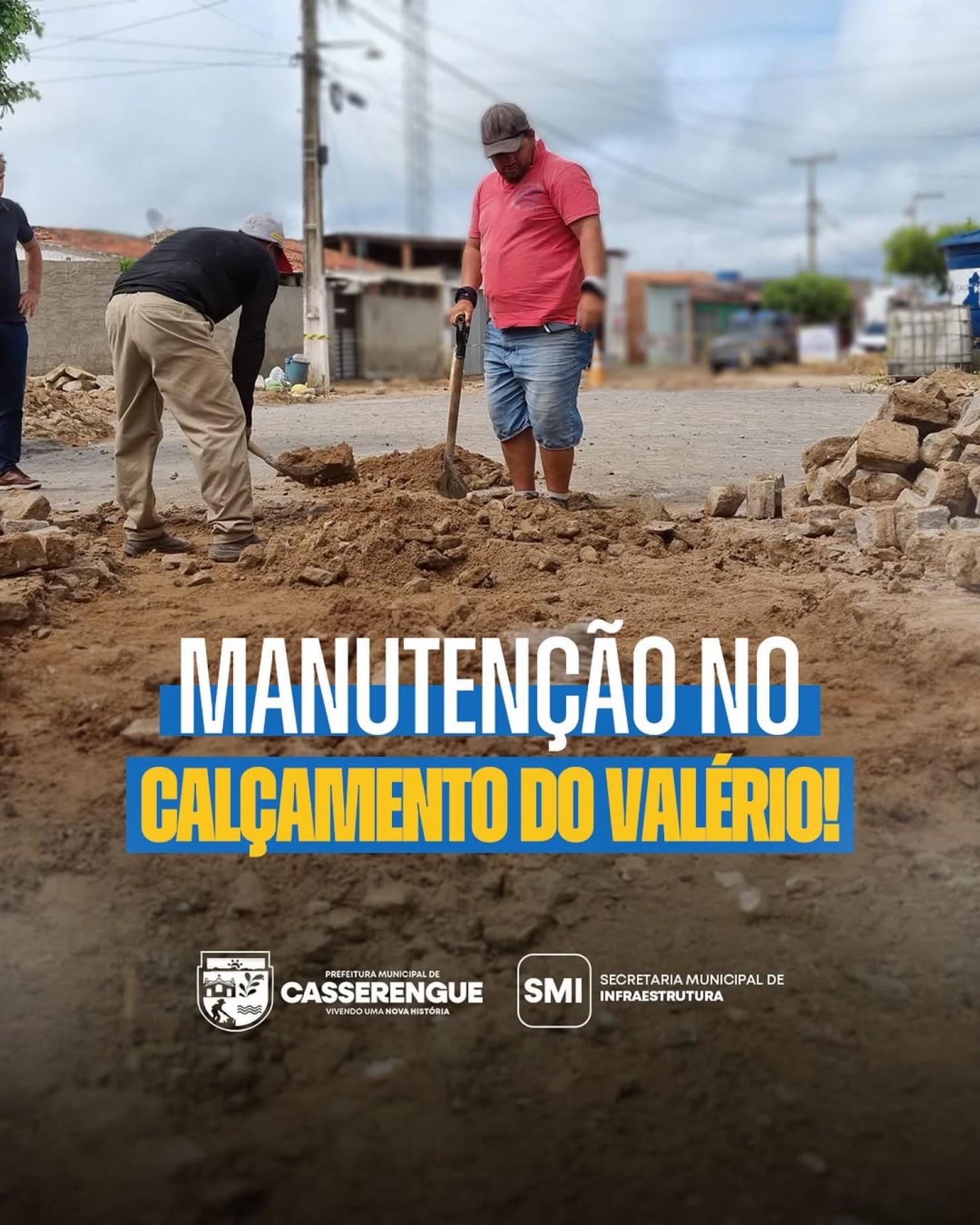 A Prefeitura Municipal de Casserengue, por meio da Secretaria de Infraestrutura, realizou nas últimas semanas os serviços de manutenção no calçamento da Rua do Valério, atendendo a mais uma demanda da população.
