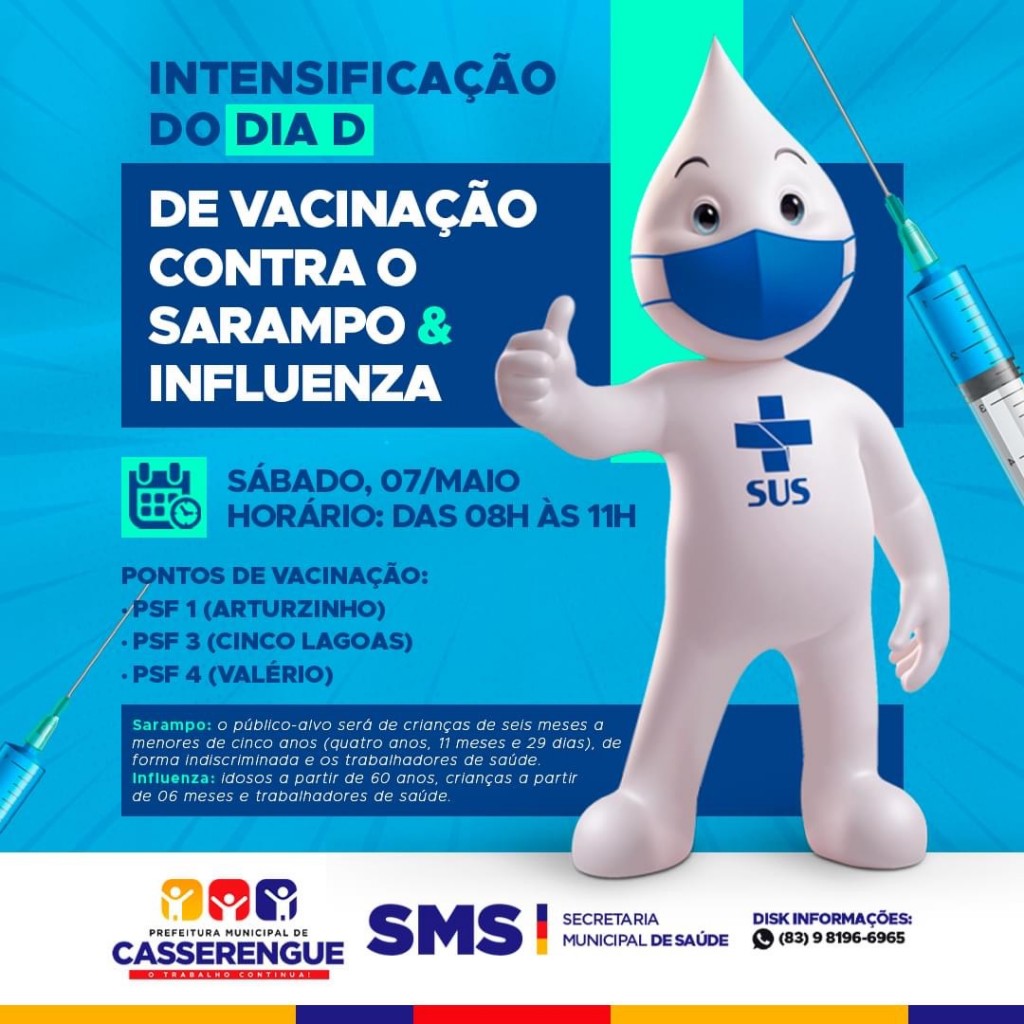 Amanhã (07), é o Dia de Intensificação do "DIA D" da Campanha Nacional de Vacinação contra o Sarampo & Influenza! Crianças de 6 meses a menores de 5 anos, Idosos com 60 anos + e trabalhadores da saúde devem ser imunizados.